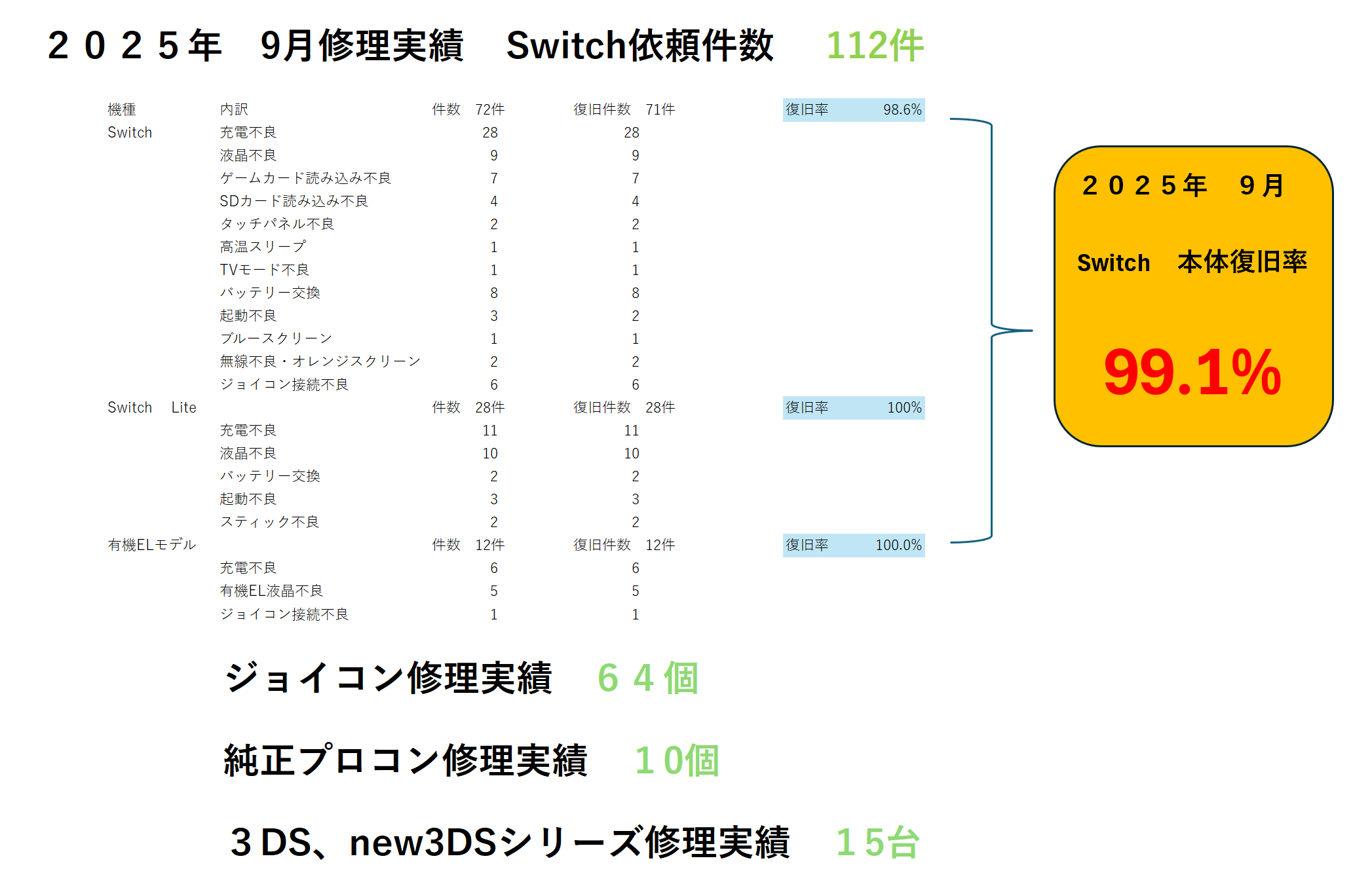 9月のSwitch本体修理は112件のご依頼がありました、復旧率は99.1%でした